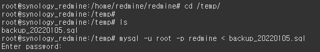 7. dump 파일을 복원합니다. ( mysql -u [userId] -p redmine < [파일명.sql] )