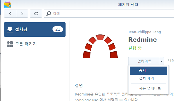 - 2.A 패키지 센터에서 Redmine을 정지합니다.