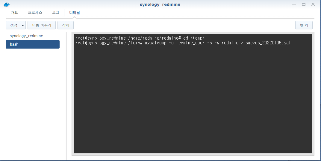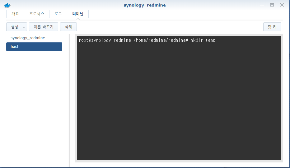 - 2.F docker - 컨테이너(redmine) - 우클릭(세부사항) - 터미널 - 생성
